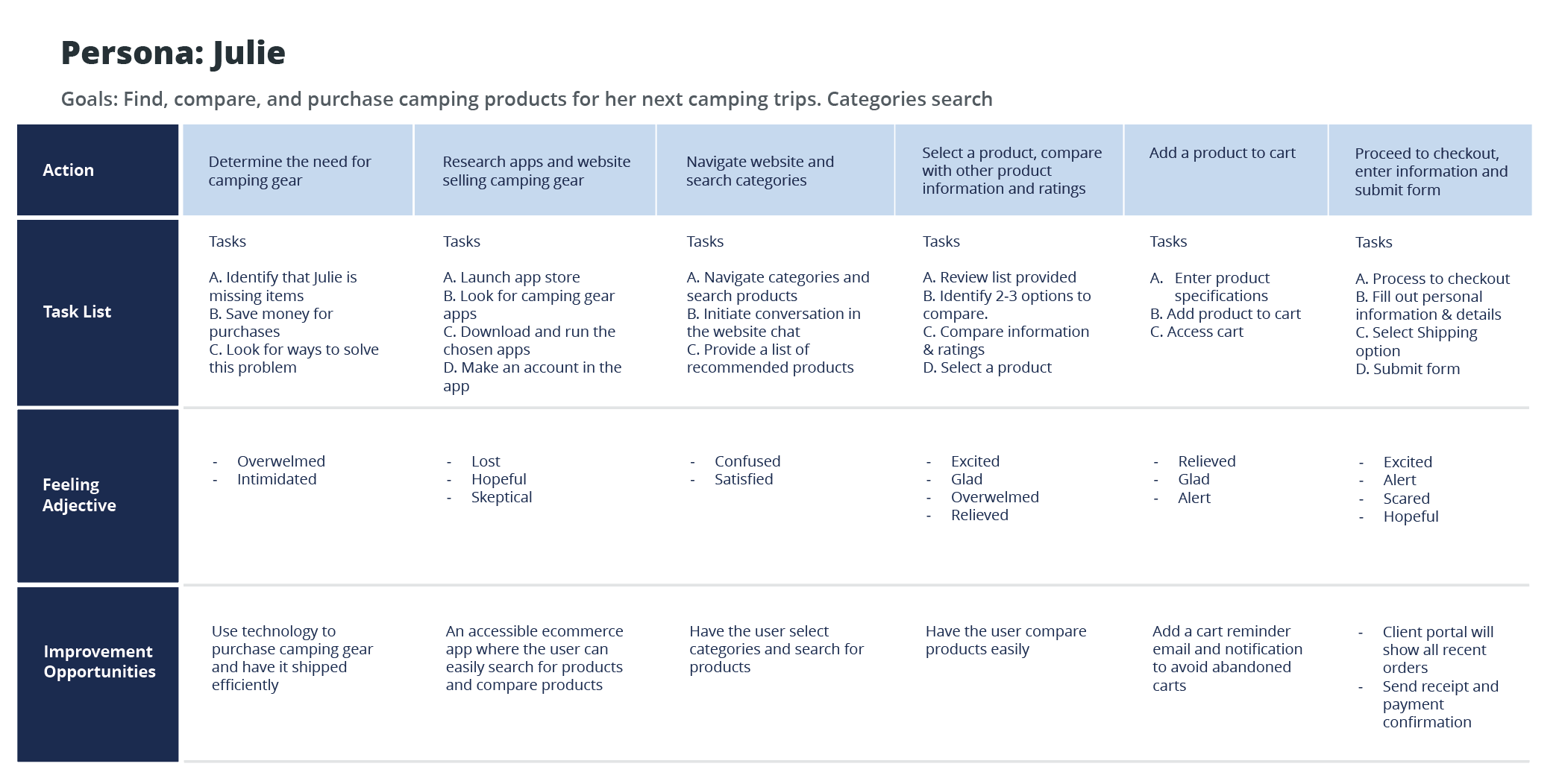 Mapping out the flow of Julie’s user journey revealed the benefits of creating an app for users without camping gear to find, compare, select, and purchase products for their future camping trips.
