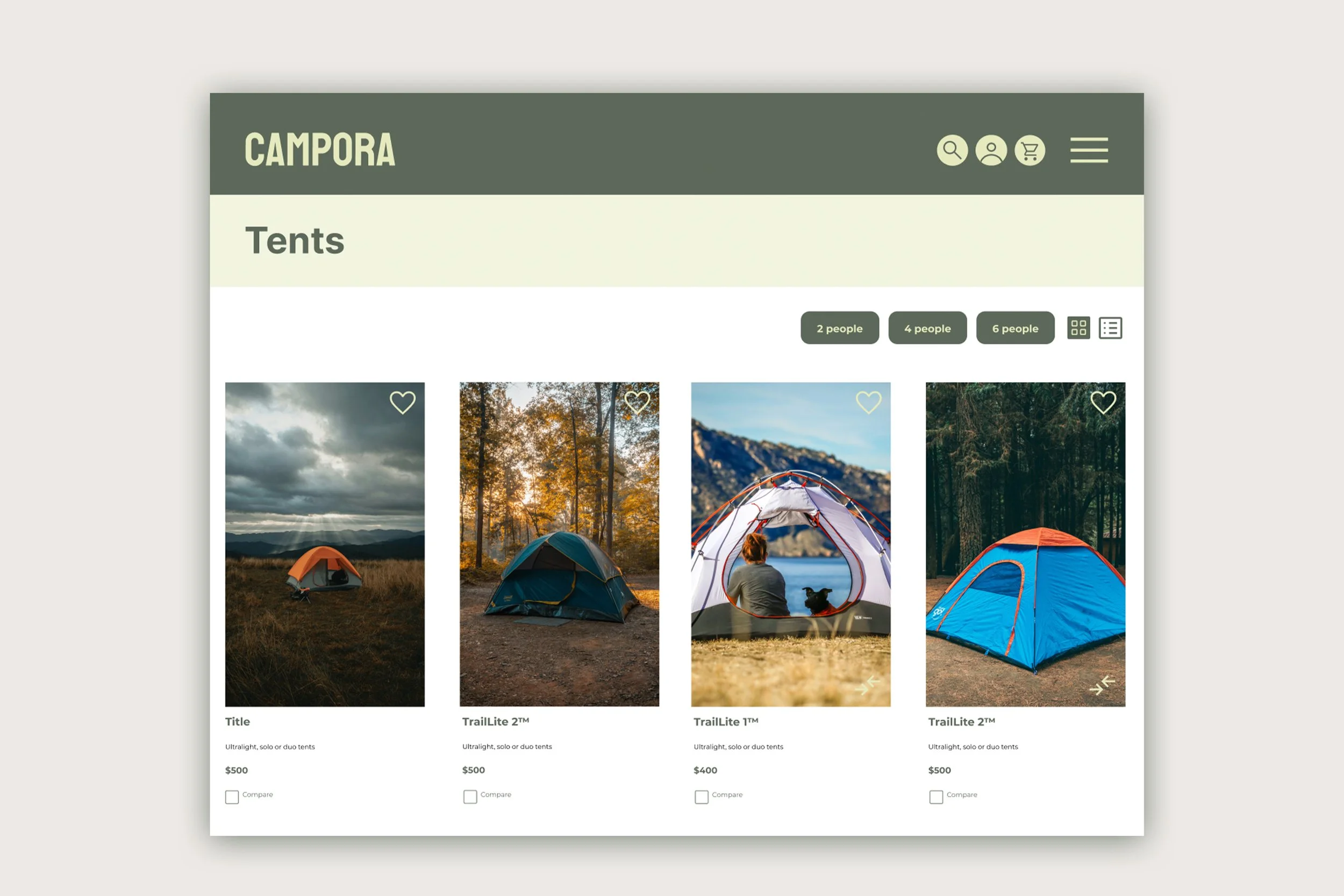Adding a filter based on the amount of people per tent facilitates navigation. A new option to view the cards in grid or list formats also helps users navigate more freely through the website.