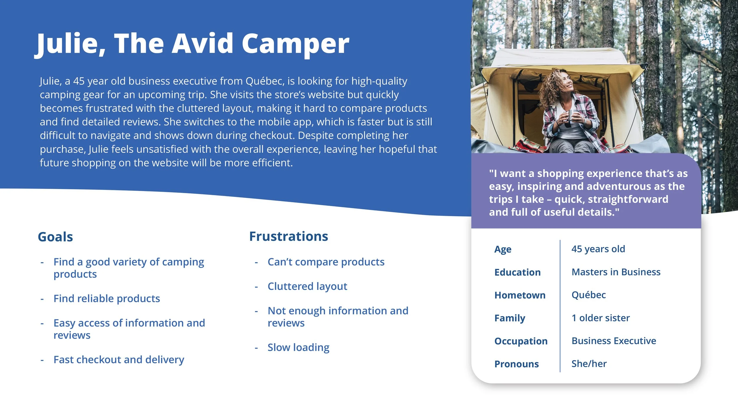 Julie is a busy executive, avid camper and gadget lover who needs to easily find, compare and purchase camping supplies because she is always travelling and on the go.