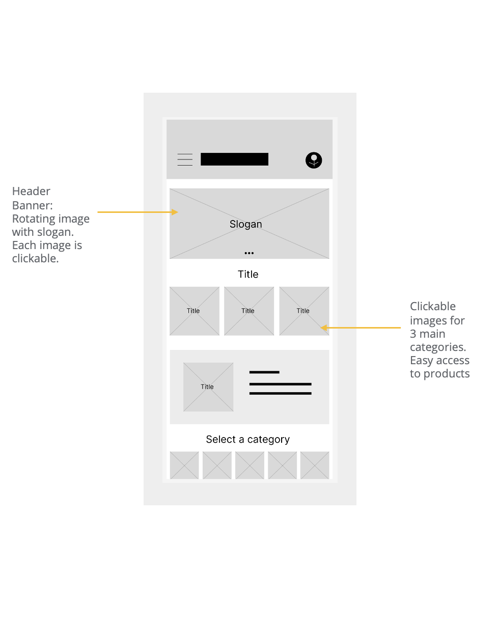 Before the usability study, the clickable links on the top menu navigation were limited. The cards were also missing depth, and the images were getting lost in the background. I rectified this by adding a drop shadow behind each card, and also adding a search and cart icons on the top navigation to facilitate user flow and easy navigation. Moving the hamburger menu to the right also felt more intuitive to the user based on their feedback.