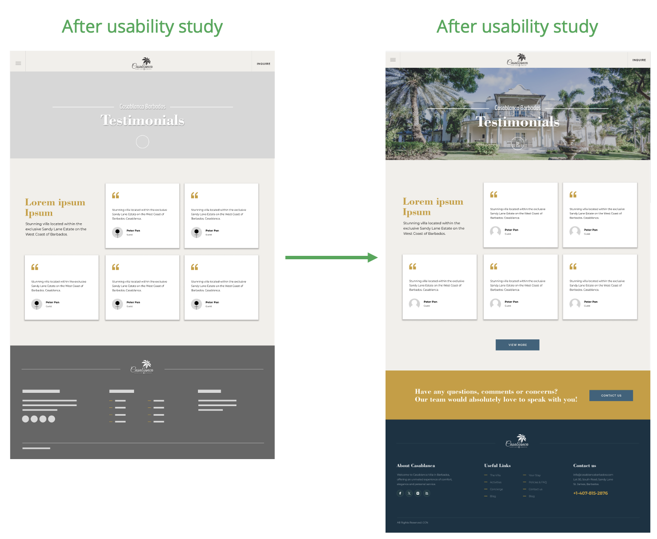 One key win was identifying the need to sprinkle testimonials throughout the website. A few reviews on specific key pages will help. Also creating a page for testimonials, allowing users to navigate to is to reinforce the feeling of confidence in the product and lead the user to booking the villa. Another important observation was the importance to prioritize the availability calendar and the Book Now button front and center. Based on my observations, I also needed to add more clear call to actions.