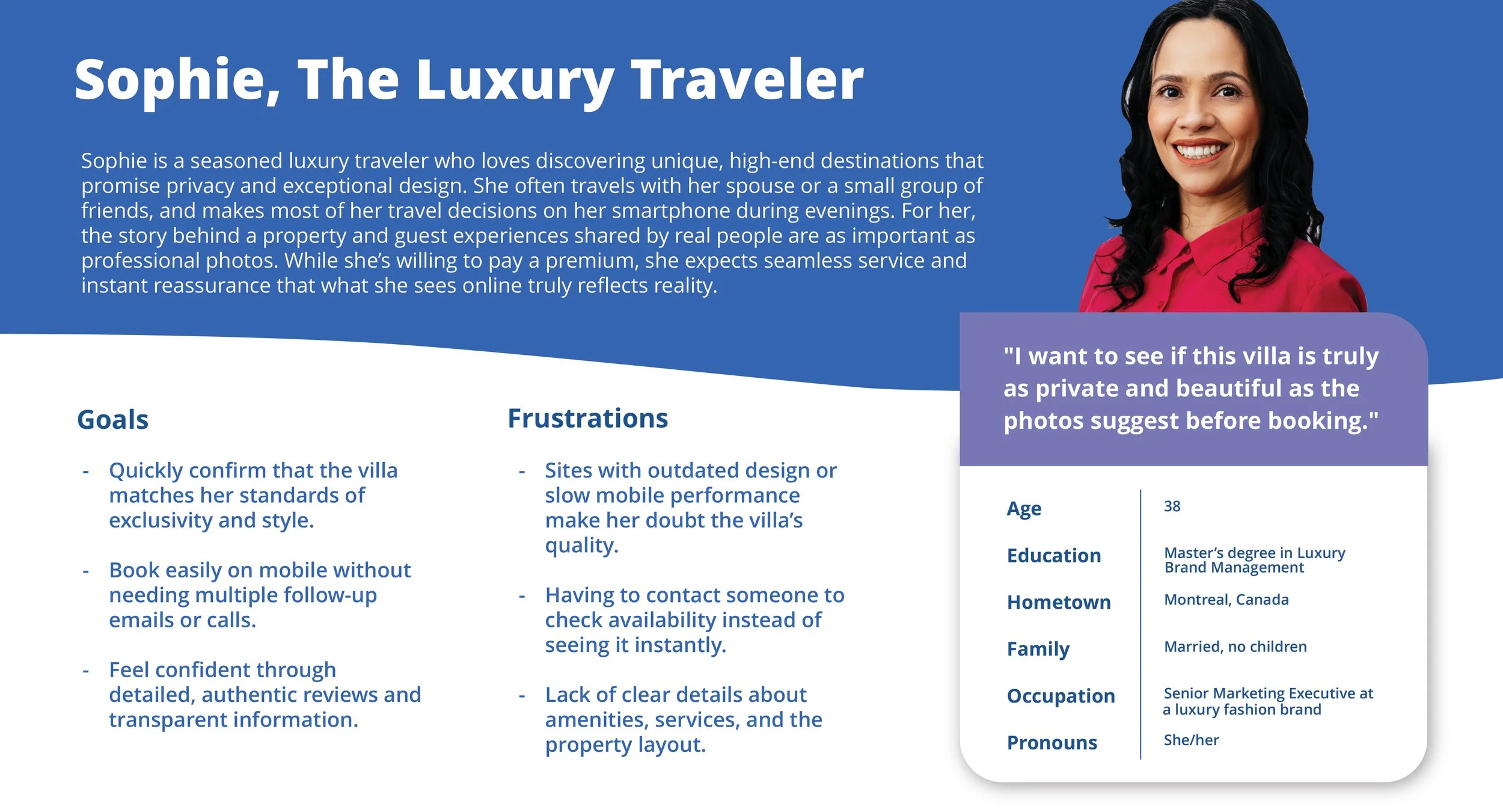 Sophie wants to feel completely confident that the villa is truly as exclusive, beautiful, and private as it appears online before she commits to booking. However, outdated design, limited authentic reviews, and a lack of clear, mobile-friendly information make her hesitate and prolong her decision.
