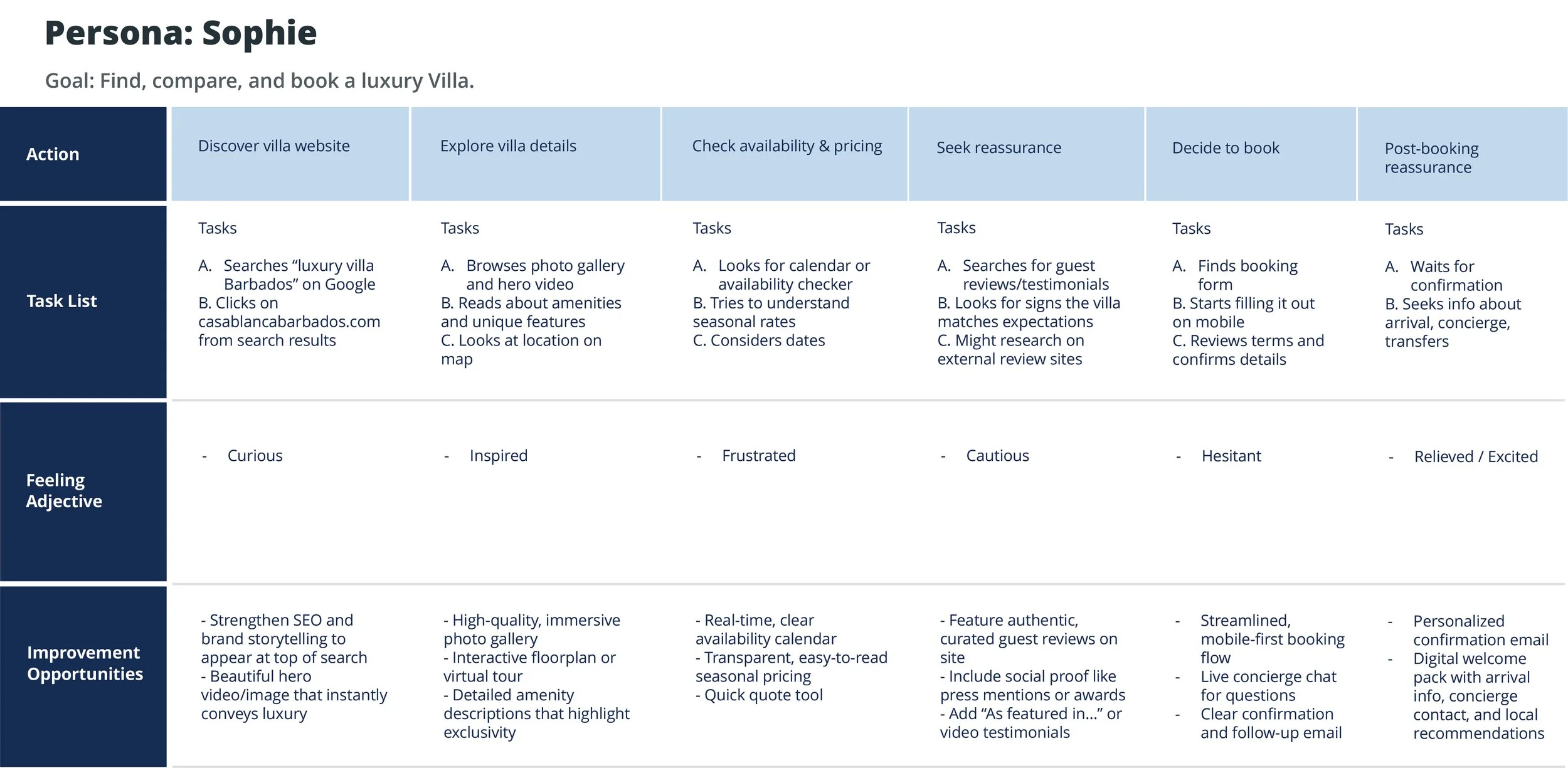 Mapping out the flow of Sophie’s user journey revealed the benefits of creating website that helps the her to quickly feel confident the villa meets her luxury standards so she can book without hesitation. Hypothesis statements: If we design an immersive gallery, guest reviews, and clear availability info, Sophie will feel more confident to book directly.
