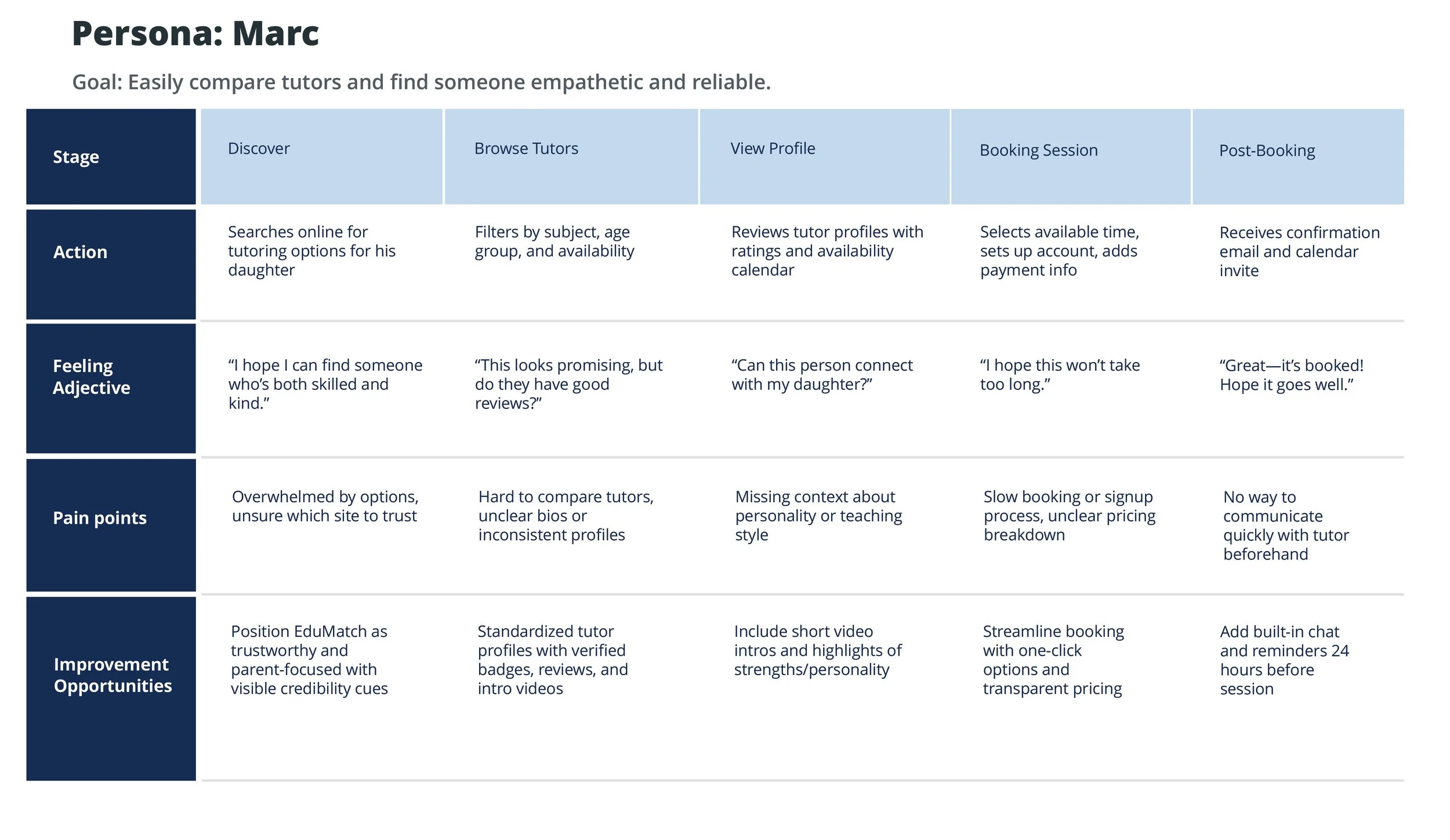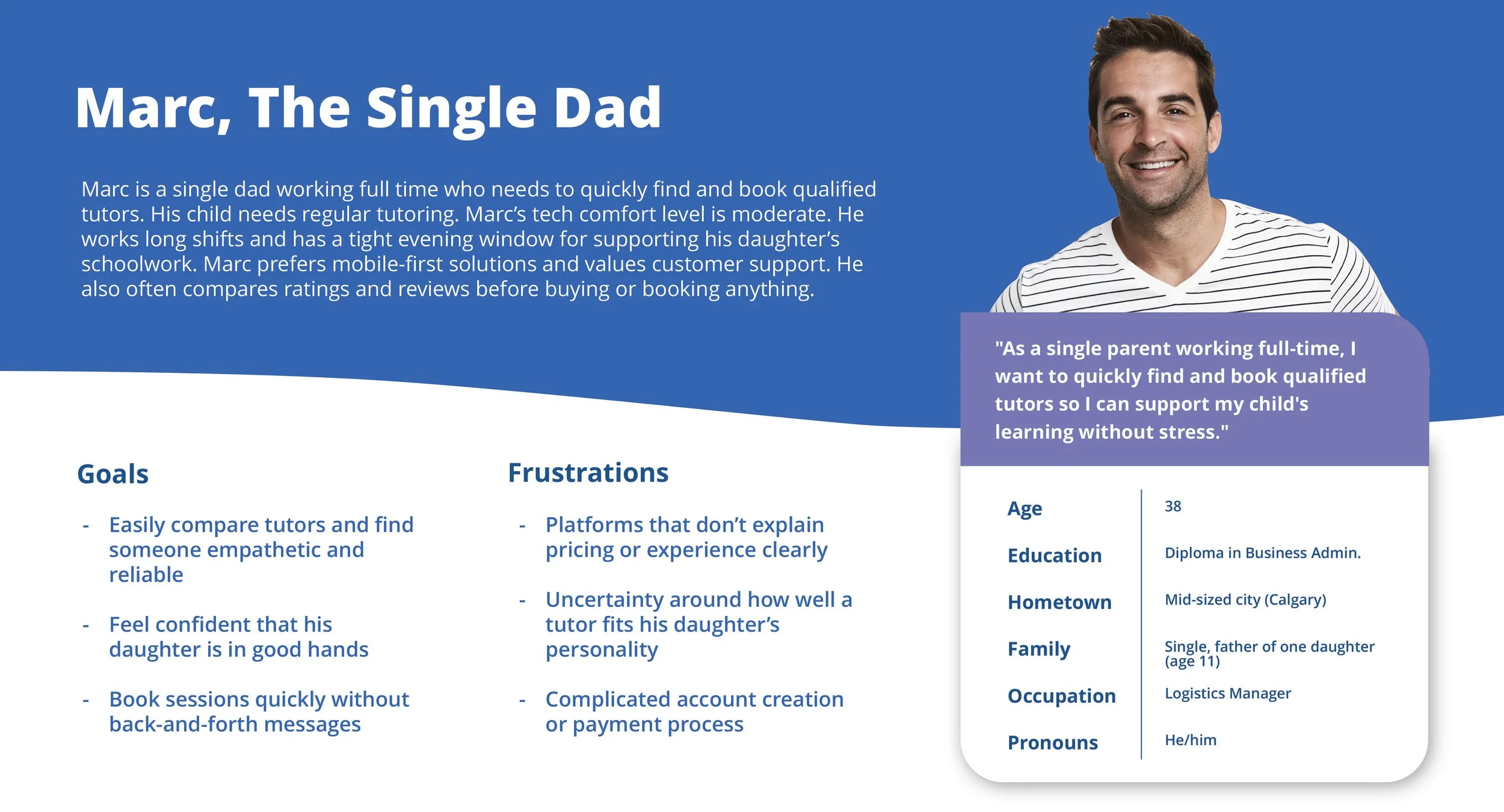 Marc is a single father with limited time and no support system to help his daughter academically. He finds it stressful and time-consuming to search, compare, and book tutors, especially when important information like teaching style or personality fit isn’t clear. He needs a simple, fast way to confidently book a tutor who is reliable and matches his daughter’s needs without added stress.