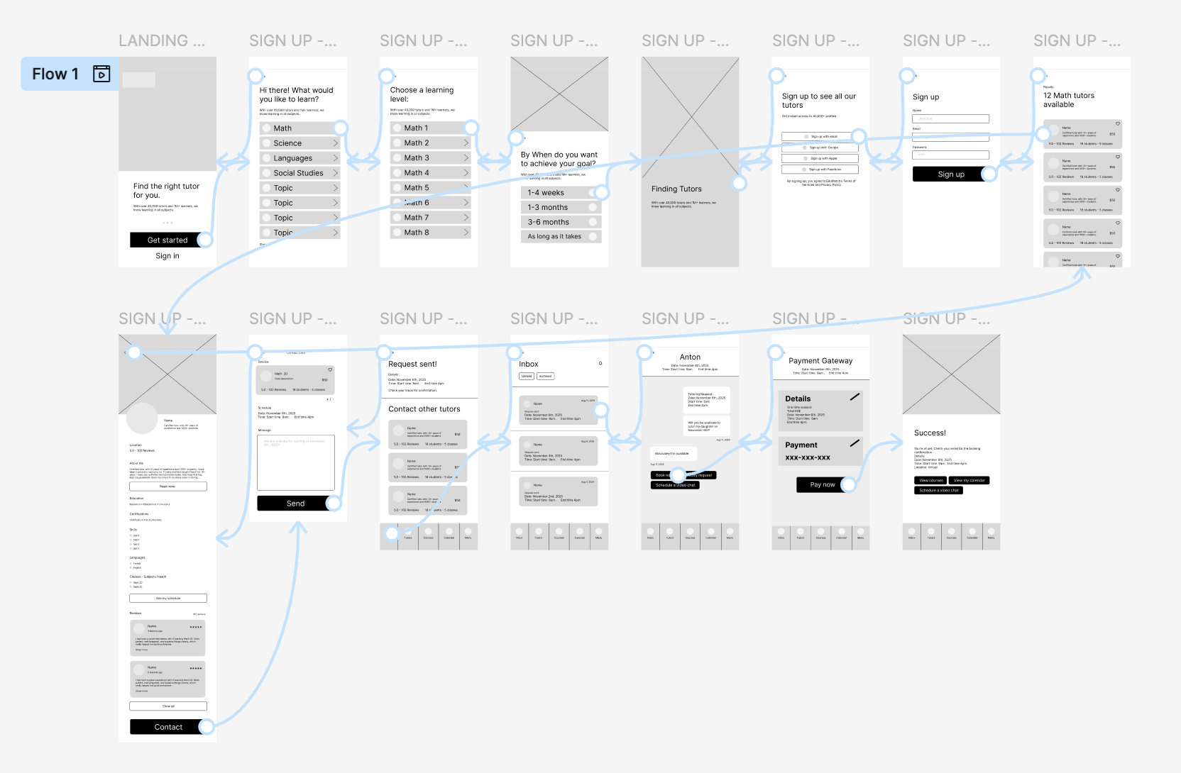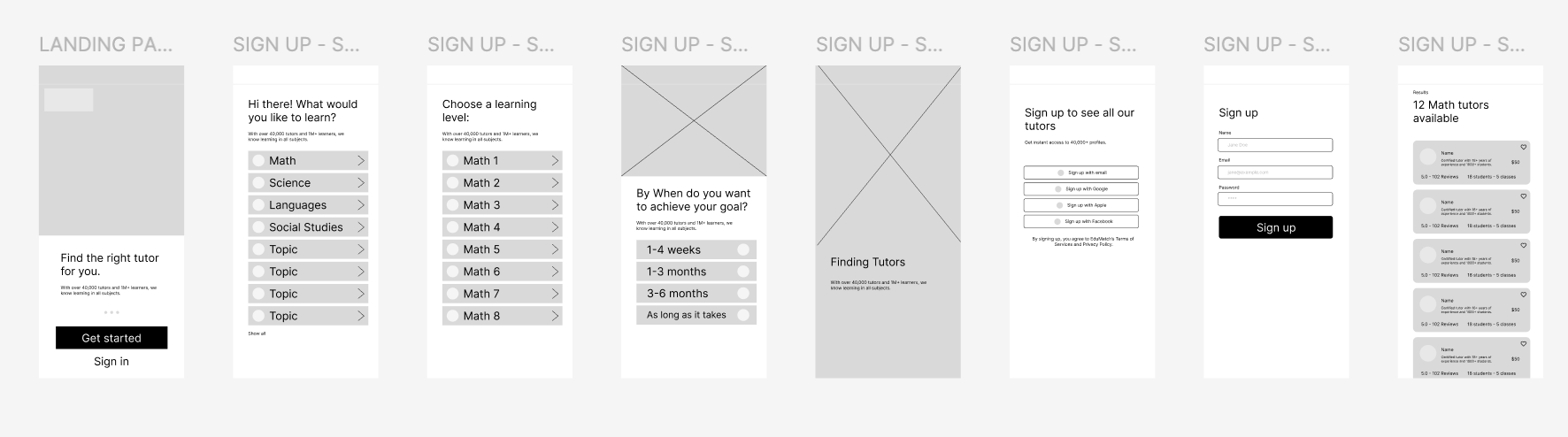 The app design presented is for an app that enable tutors to list their services and parents to search for and book time with tutors. The illustration showcases the user flow from the landing page, sign up process, searching / finding a tutor, individual profile page, submitting a request, checkout, and more.
