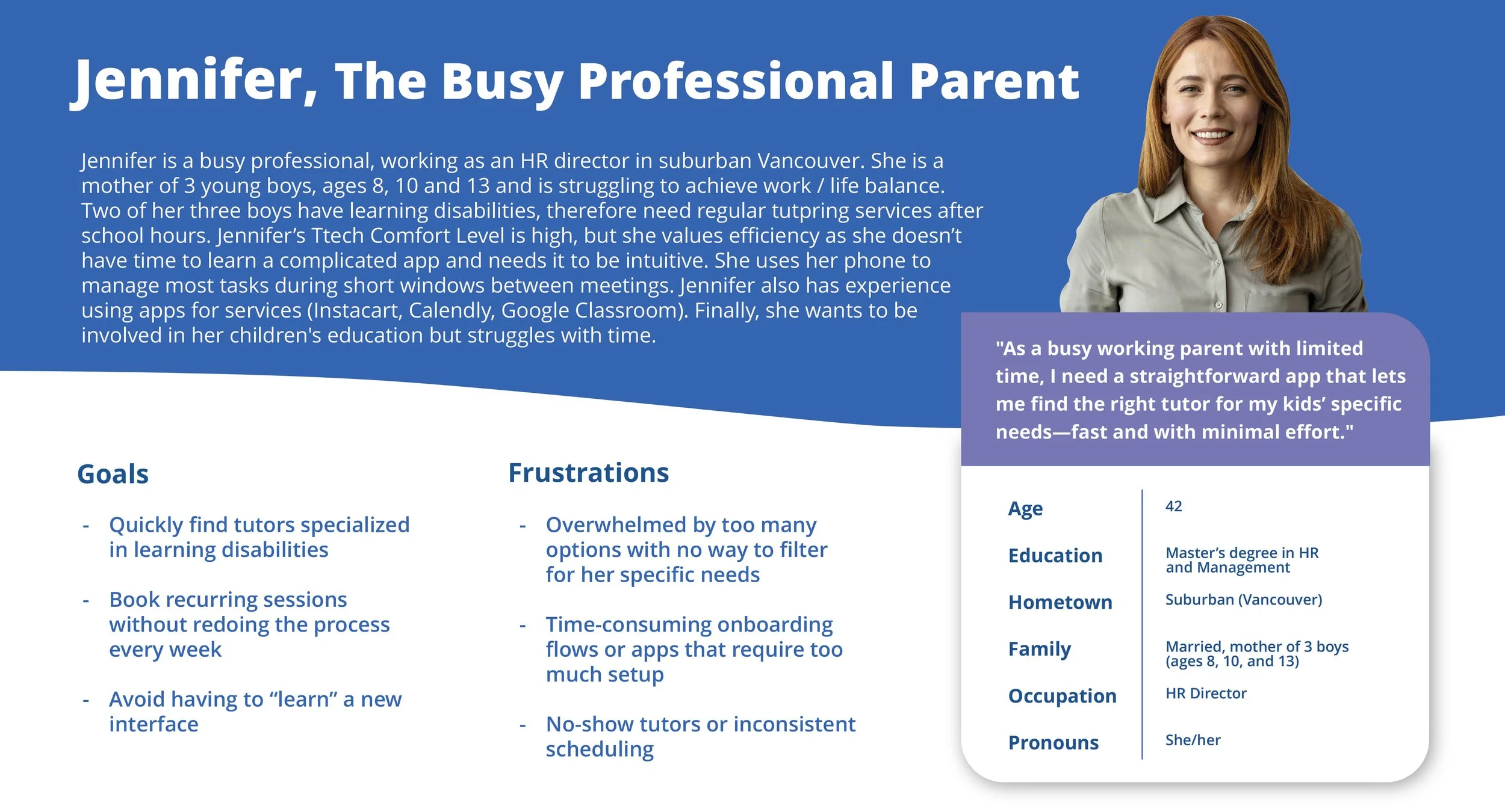 Jennifer is a working professional and mother of three boys, two of whom have learning disabilities. She is overwhelmed by the complexity of finding specialized tutors and doesn't have time to learn or navigate a complicated app. She needs an intuitive, easy-to-use platform that allows her to quickly filter by qualifications and availability, and book trusted tutors without wasting time or repeating tasks every week.
